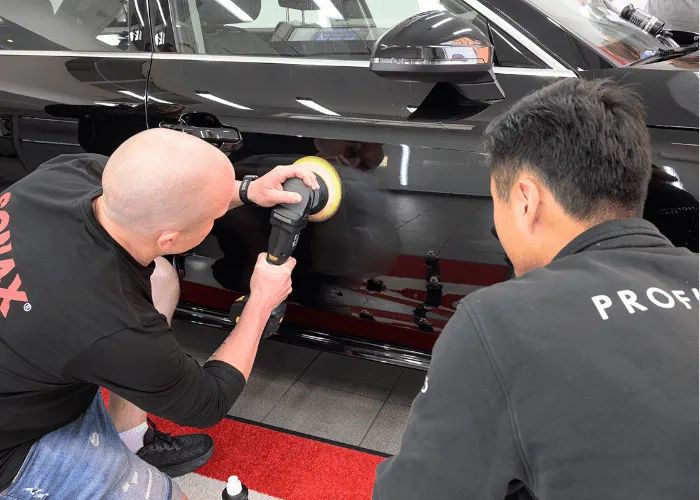 Därefter utförs en anpassad polering av bilen för att uppnå högsta möjliga glans och samtidigt bli av med dina ytliga repor i lacken.